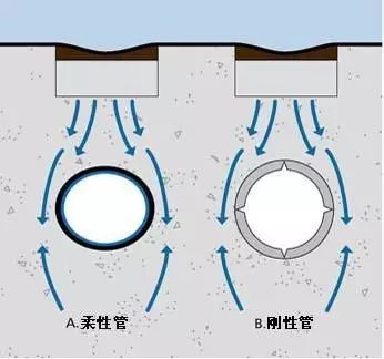 塑料管屬于柔性管,在受外壓負荷時,柔性管和剛性管的承受負載的機理是全部不同的。柔性管在受壓破壞之前,可以有較大的變形,而剛性管在受外壓破壞之前不可能有較大變形。當剛性管受外壓時,負載全部經(jīng)過管材壁傳遞到底部的管床上,在管材壁內(nèi)產(chǎn)生彎矩,隨著管材直徑加大,管壁的彎矩和應力急劇加大,所以大直徑的混凝土排水管常常需加鋼筋,而柔性管在受壓破壞前先變形----橫向外擴,管材周圍的回填土壤可以起到阻止柔性管變形和外擴的作用,外壓負載就被傳遞和分攤到周圍的回填土中去了。所以,在同樣外壓負載下柔性管管壁內(nèi)的應力較小,它和周圍的回填土共同承受負載,管土共同作用。因此,塑料埋地排水管不需和剛性混凝土管一樣的強度和剛度,在合理的剛度下,是全部可以達到使用要求的,這一點已被歐洲發(fā)達的應用實踐所證明。